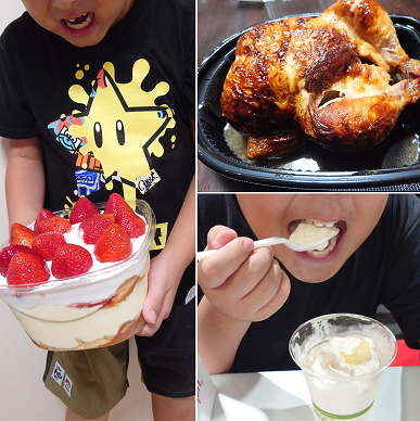 全てがでかい。大きなチキンの丸焼きやパン。デザートを購入し、アイスまで食べて帰りました。