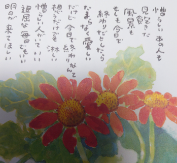 相当な努力の結果、上手に口にくわえた筆で、絵を描いて詩を書いて。