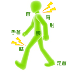 肩こり、五十肩、ムチウチ、腰痛、ぎっくり腰、関節痛、ねんざ、けんしょう炎、手足のしびれ、神経痛、冷え症、スポーツ障害など